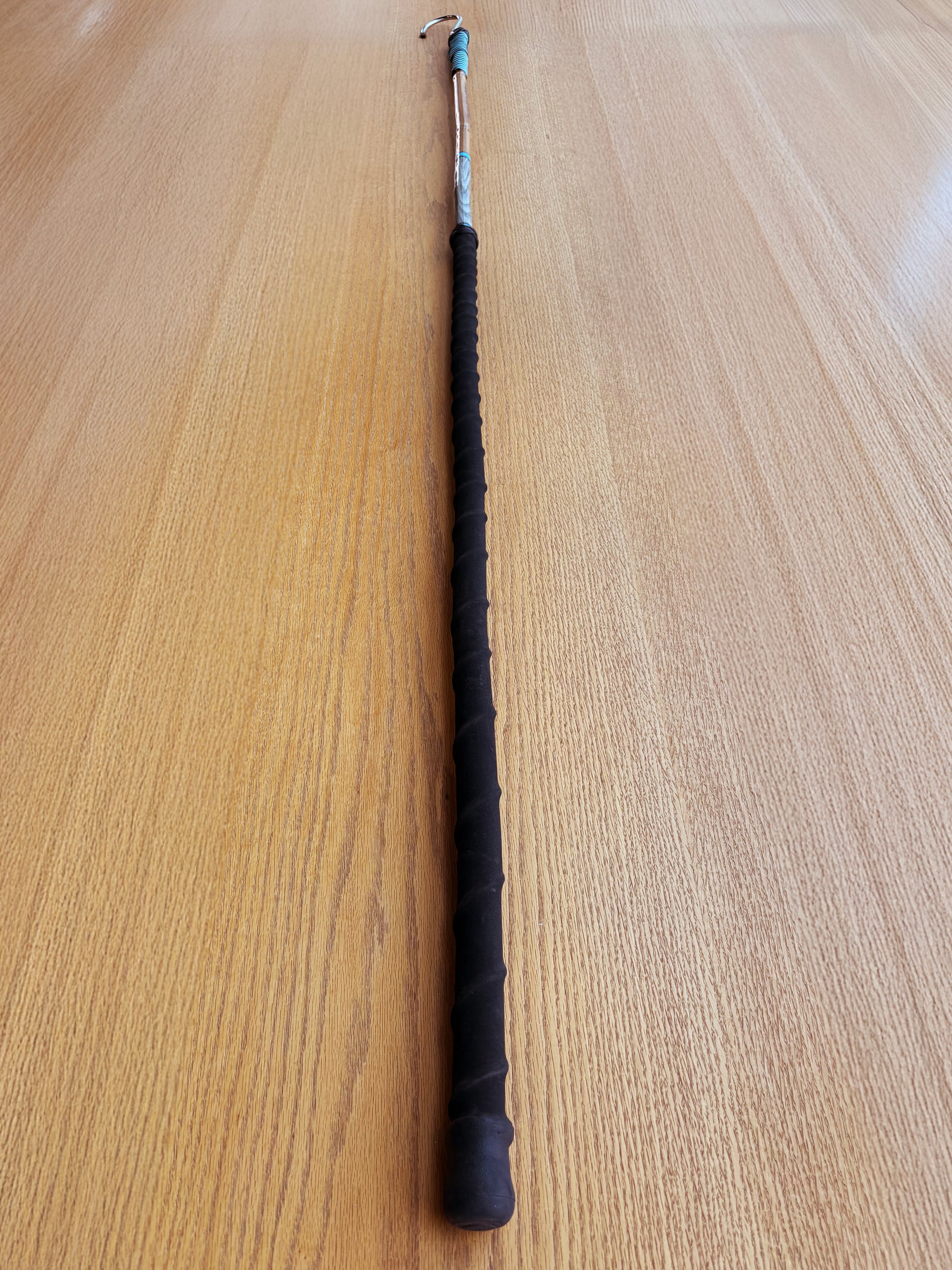 The lower handle features a contoured, rubberized grip with spiral grooves for enhanced control even in wet conditions. The upper wrapping near the hook ensures a secure hold during critical lifting.