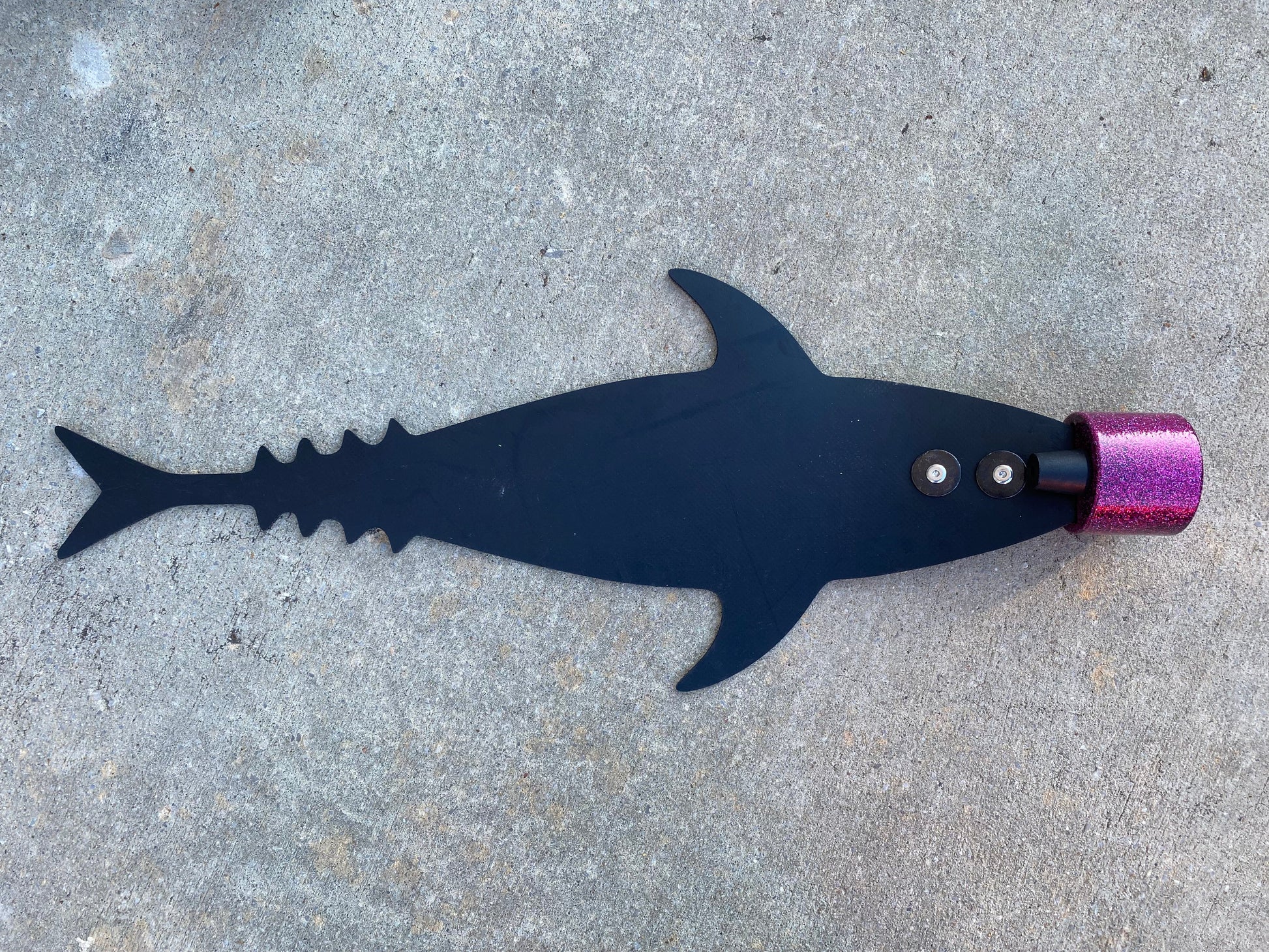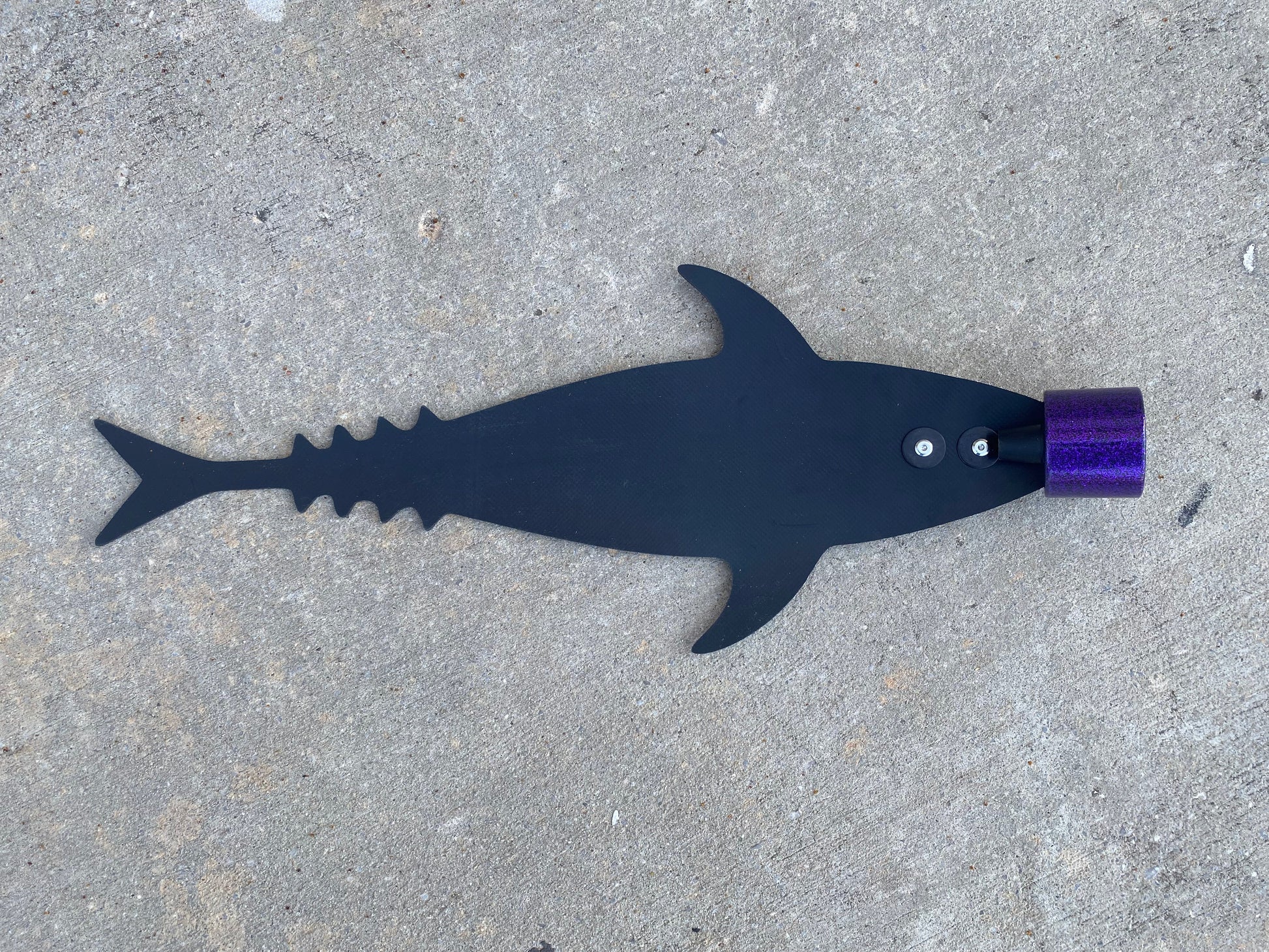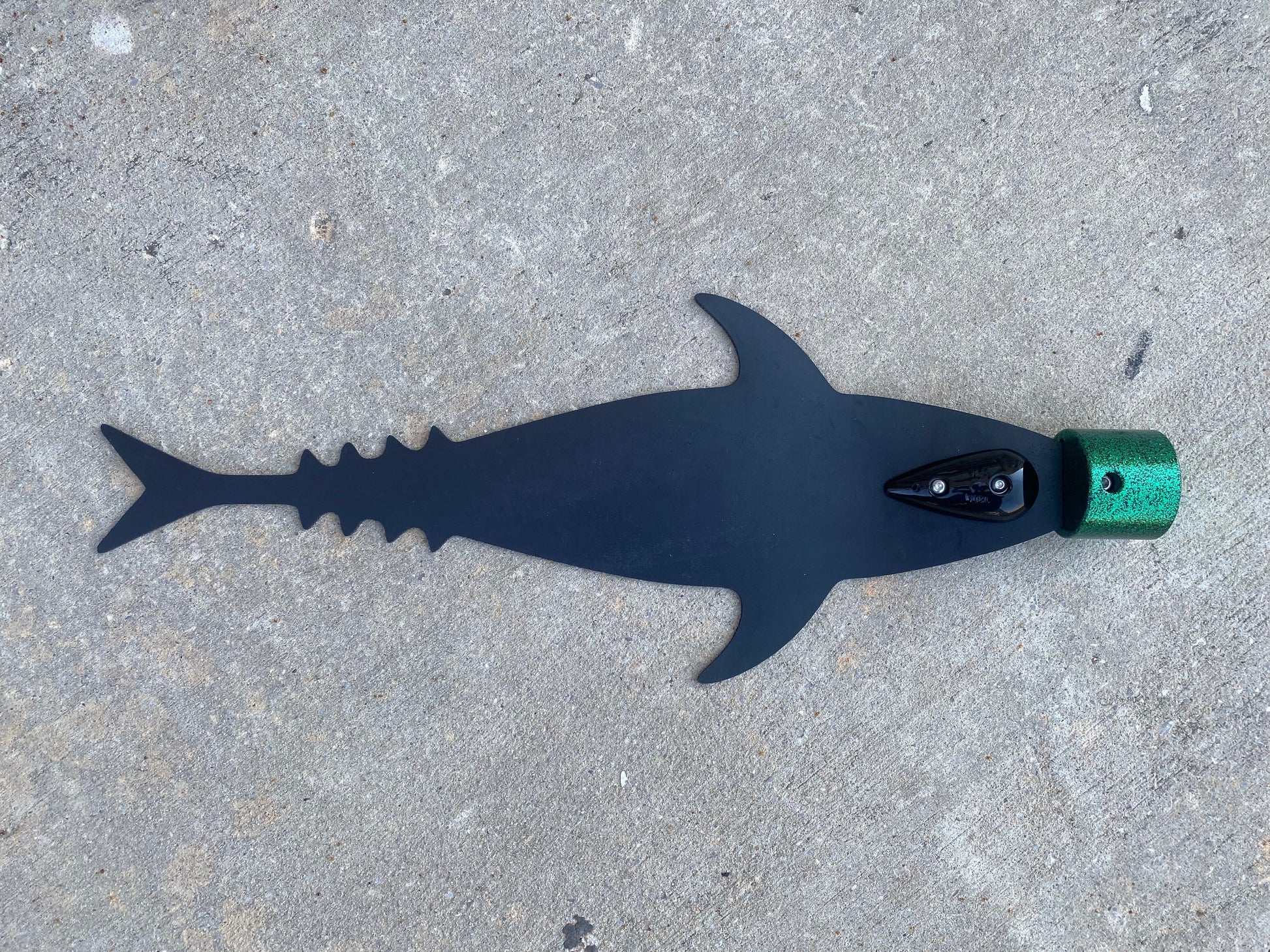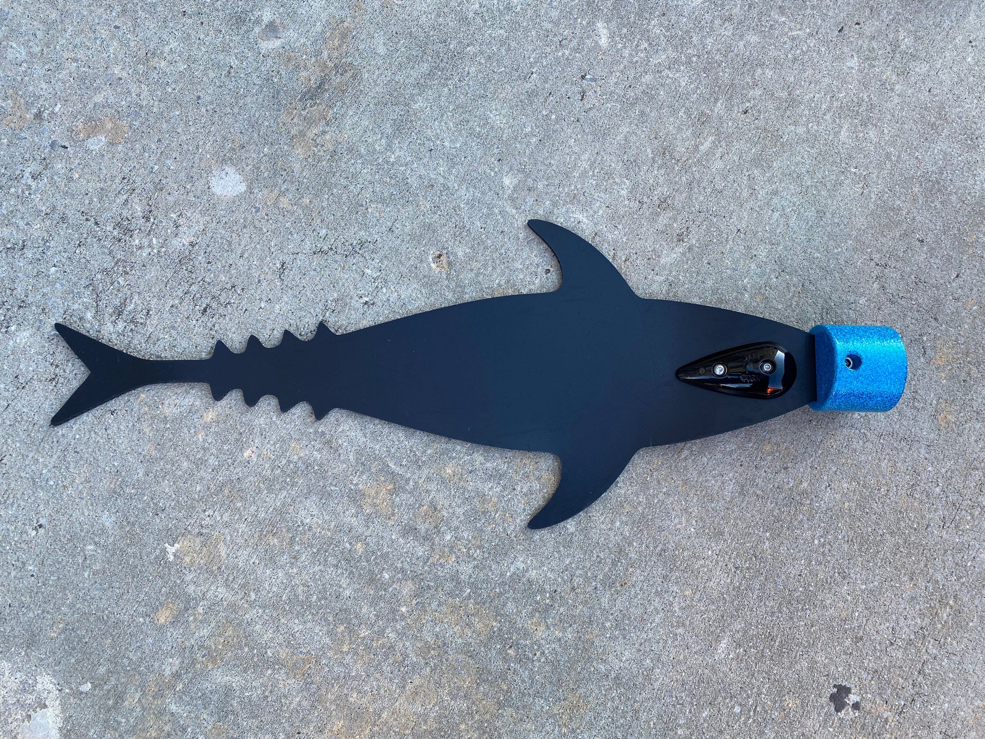 "This looks like a schooling 30-50 lb tuna, It might look like it's feeding on squids behind a chain or has fallen out of the school. Whatever the story is, it will entice a marlin to investigate. This one will more than likely get bit as opposed to the bigger flaps that may just get wacked or get looked at. The action of this is a deep diving and then pushing lure. It does whatever it wants; depending on the angle pull, wave face position, and sea condition, it will run a bit different."