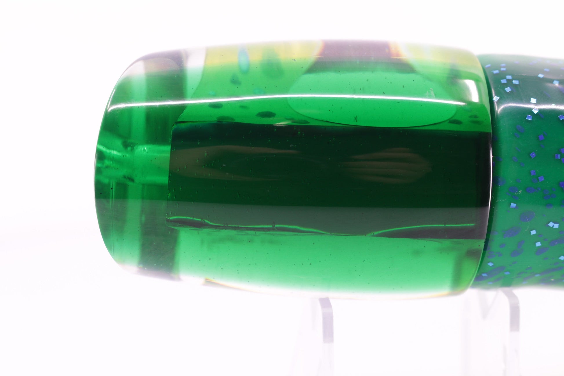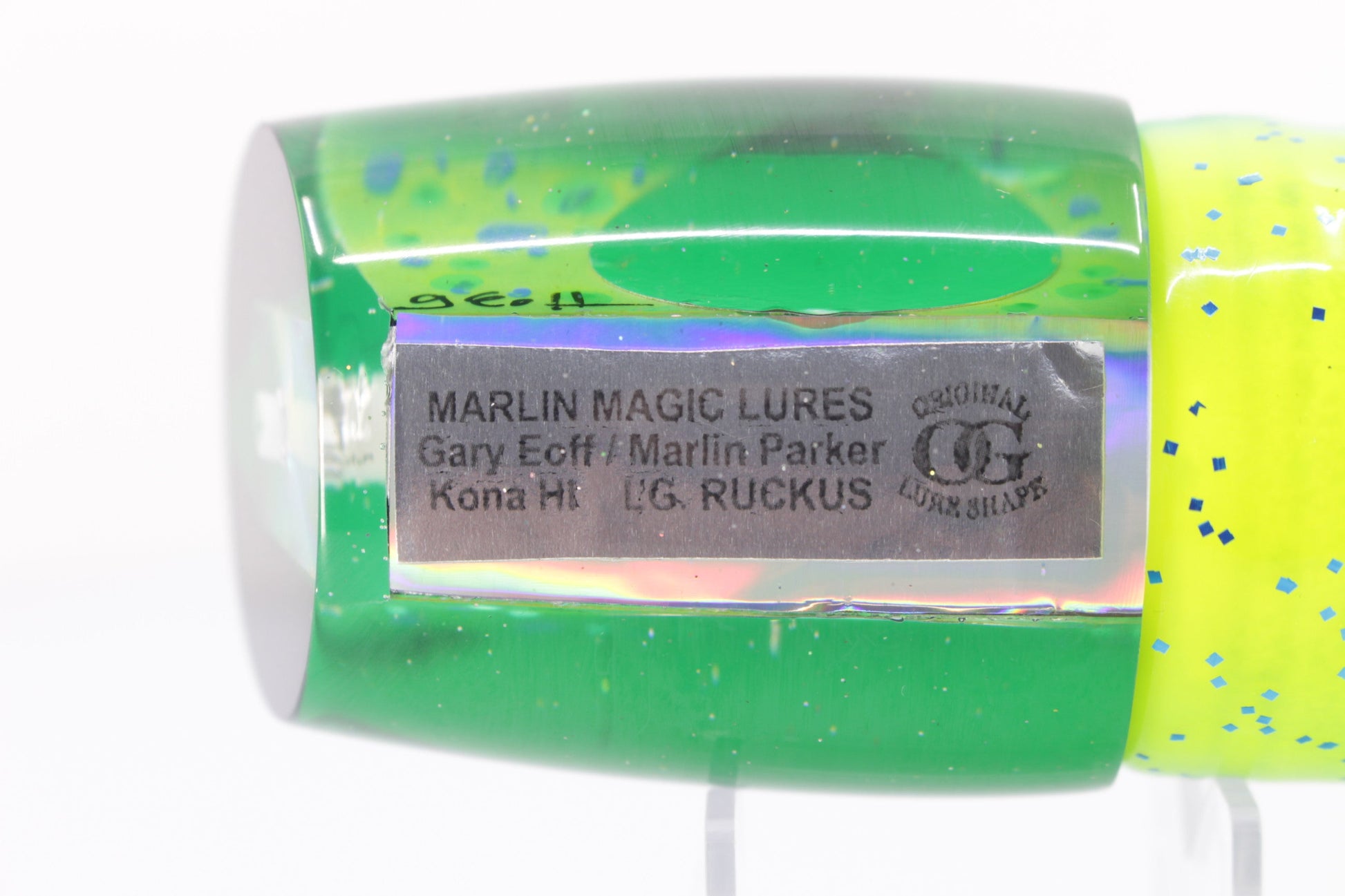 The Marlin Magic Ruckus is perhaps their most famous Marlin lure. This is the Large 14" size. Has 14" sized skirt saddles with a fairly steady taper towards the slanted nose. The reputation of the lure can be derived from its name alone - it creates a "ruckus" in the water that stir up fish like crazy while staying mostly at the surface. It has an aggressive surface action, providing a ton of smoke trailing the lure. While you can get this lure to run in rougher waters, we do not necessarily recommend this lure for the roughest of sea conditions but more in calm to moderately rough conditions.